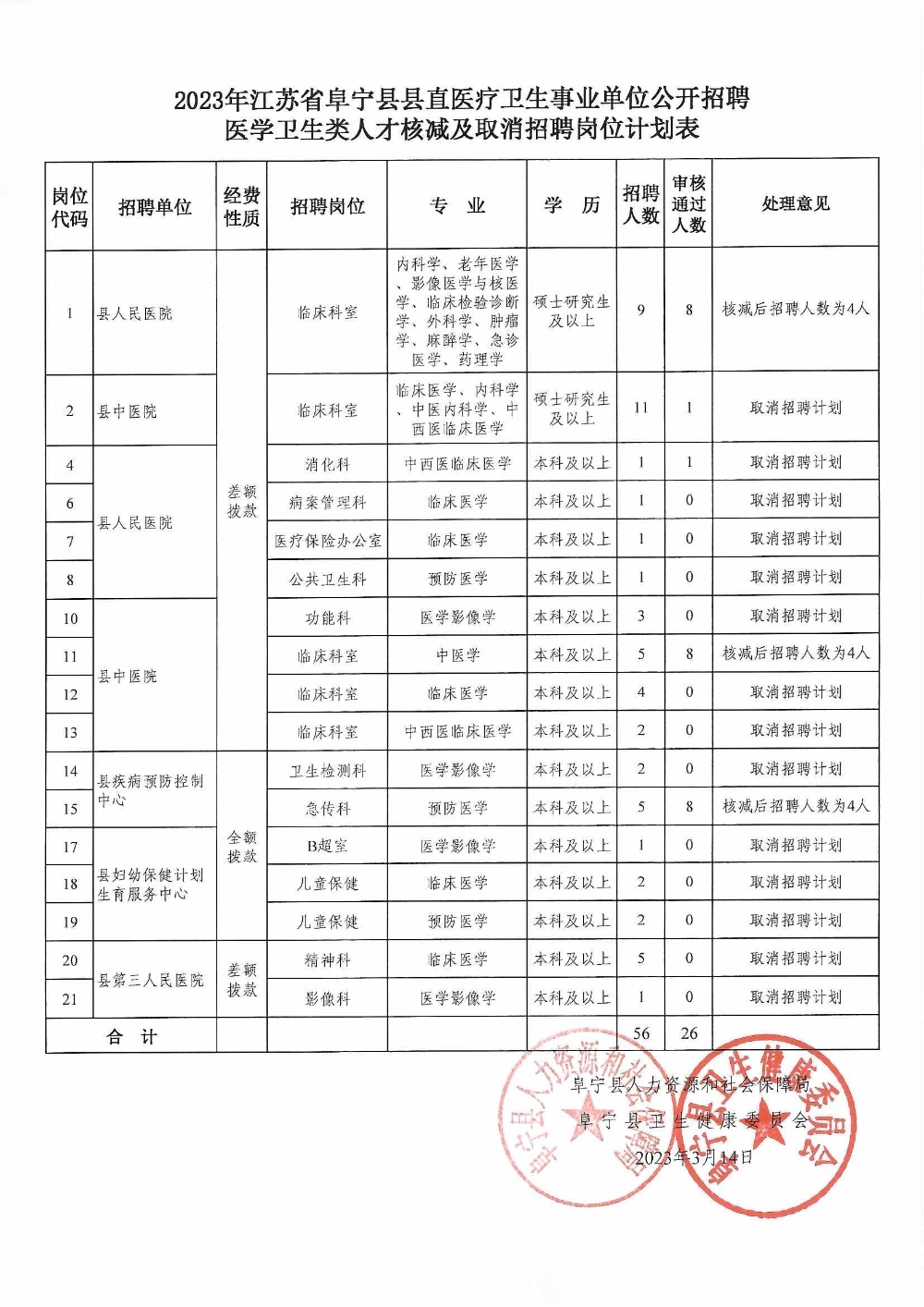 2023年江苏省阜宁县县直医疗卫生事业单位公开招聘医学卫生类人才核减及取消招聘岗位计划表